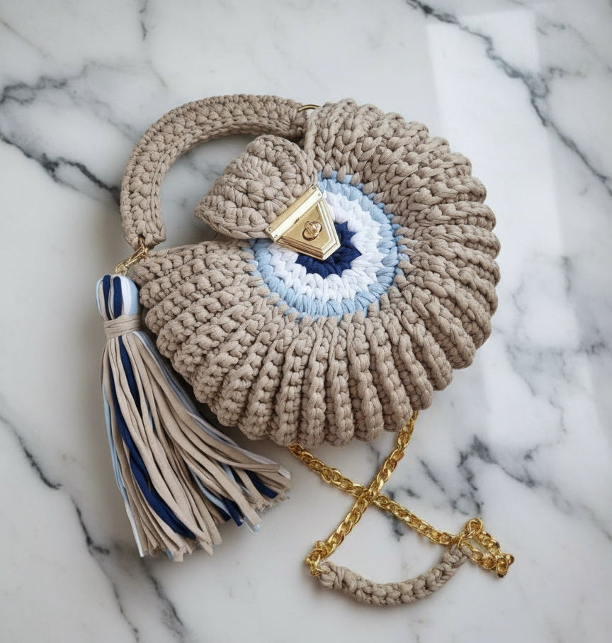 Handmade crocheted top handle bag made of premium T-shirt combed yarn with cottons.